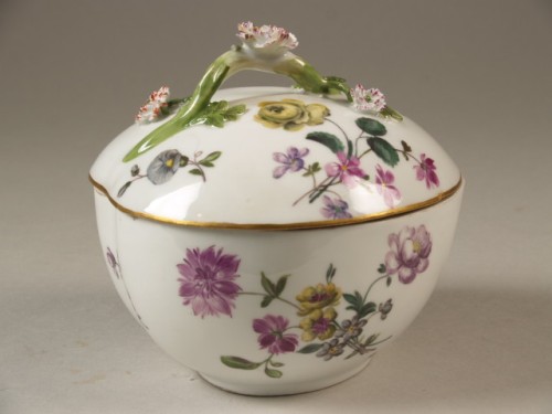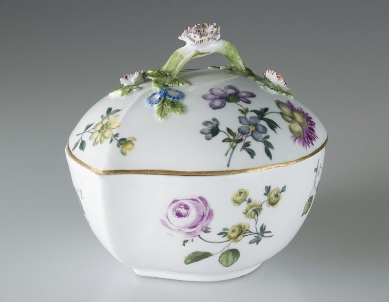 Dekselterrientje van Meissen porselein. Gedecoreerd met veelkleurige bloementuilen